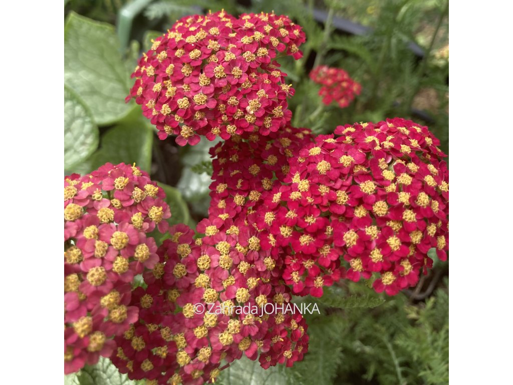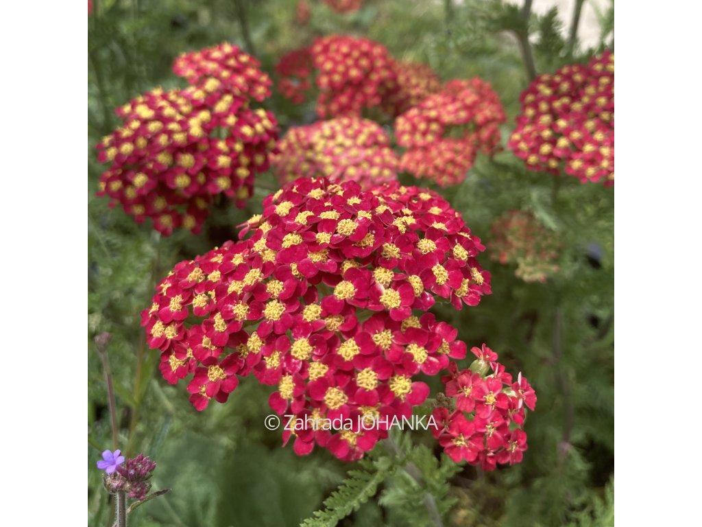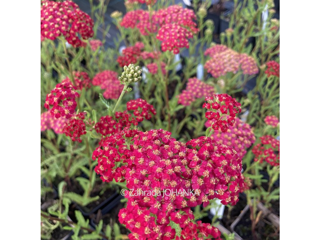 Řebříček - květy v odstínech červené barvy, žlutý střed, kvete VI - VIII, 65 cm, šedozelené listy, slunce, sucho, polosucho