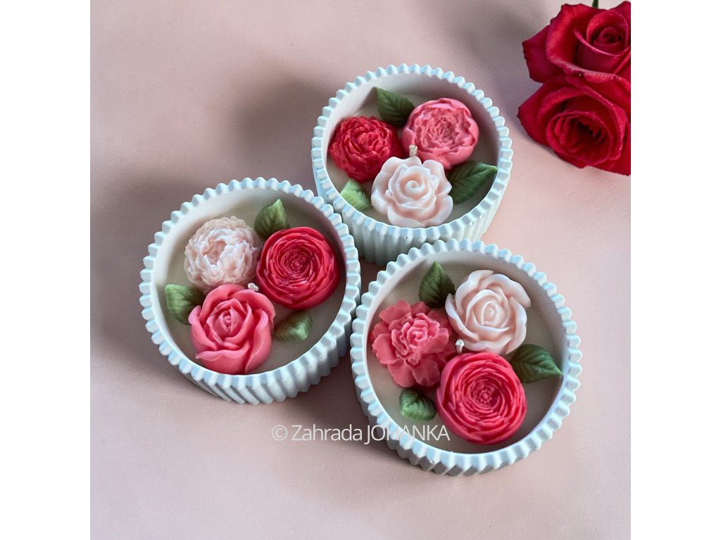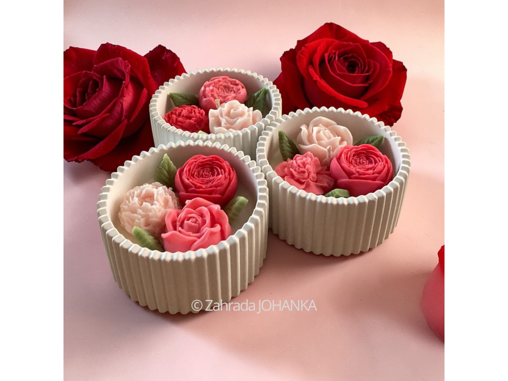 Nádobka je rovněž ručně vyrobena z inovativní směsi české výroby na bázi kararského mramoru. Po vytvrzení je sametově hladká, čistě bílé barvy, velice pevná a tepelně odolná do 500 °C. Doporučujeme ji po vypálení svíčky zachovat a vhodně použít. Naše nádobky se vyznačují především tím, že nevyžadují po vytvrzení uvnitř nádoby žádné dodatečné ošetření chemickými látkami (akrylovými laky, apod.). Jsou tedy při vypalování vosku zcela zdravotně nezávadné. Směs neobsahuje pryskyřičná a sádrová pojiva, která mohou při vyšších teplotách praskat.