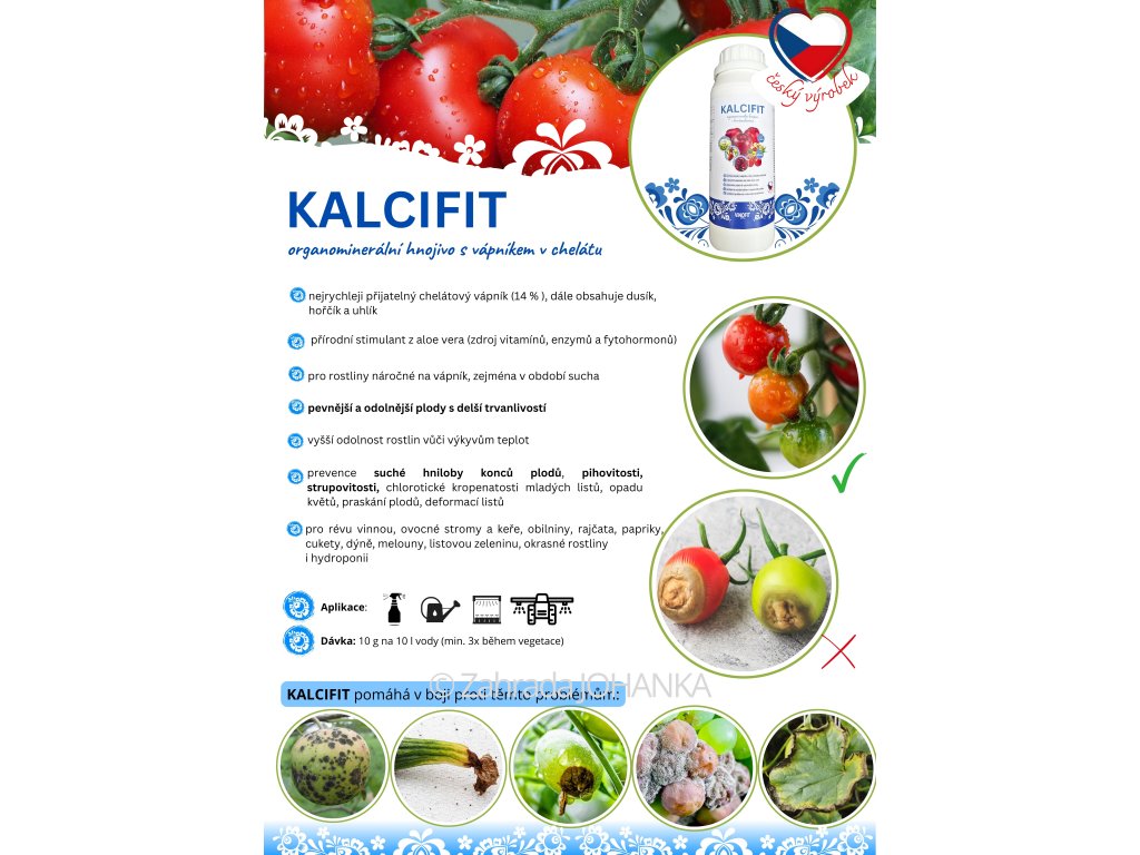 KALCIFIT je nejnovější přírůstek do rodiny VÍNOFIT hnojiv a svým složením zcela ojedinělé práškové vodorozpustné hnojivo s vysokým obsahem velmi rychle dostupného vápníku (Ca-EDTA). Je navíc obohaceno o přírodní stimulant na bázi aloe vera, které hnojivu propůjčuje řadu přírodních látek včetně růstových hormonů.
