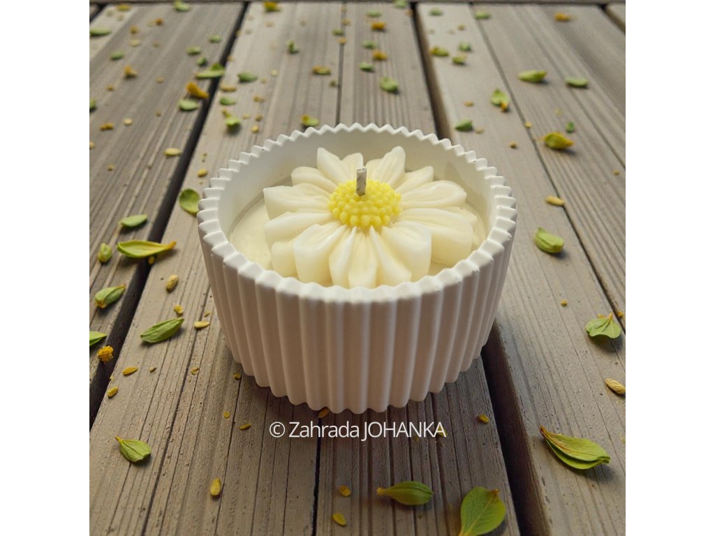 Nádobka je rovněž ručně vyrobena z inovativní směsi české výroby na bázi kararského mramoru. Po vytvrzení je sametově hladká, čistě bílé barvy, velice pevná a tepelně odolná do 500 °C. Doporučujeme ji po vypálení svíčky zachovat a vhodně použít. Naše nádobky se vyznačují především tím, že nevyžadují po vytvrzení žádné dodatečné ošetření chemickými látkami (akrylovými laky, apod.). Jsou tedy při vypalování vosku zcela zdravotně nezávadné. Směs neobsahuje pryskyřičná a sádrová pojiva, která mohou při vyšších teplotách praskat.