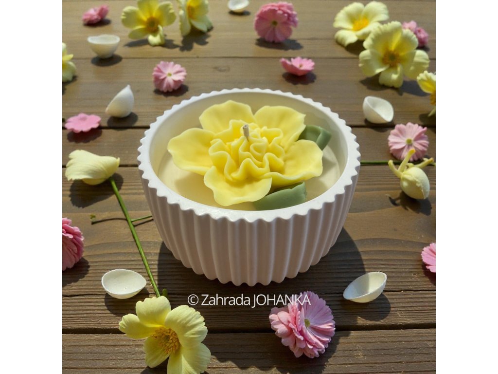 Nádobka je rovněž ručně vyrobena z inovativní směsi české výroby na bázi kararského mramoru. Po vytvrzení je sametově hladká, čistě bílé barvy, velice pevná a tepelně odolná do 500 °C. Doporučujeme ji po vypálení svíčky zachovat a vhodně použít. Naše nádobky se vyznačují především tím, že nevyžadují po vytvrzení žádné dodatečné ošetření chemickými látkami (akrylovými laky, apod.). Jsou tedy při vypalování vosku zcela zdravotně nezávadné. Směs neobsahuje pryskyřičná a sádrová pojiva, která mohou při vyšších teplotách praskat.