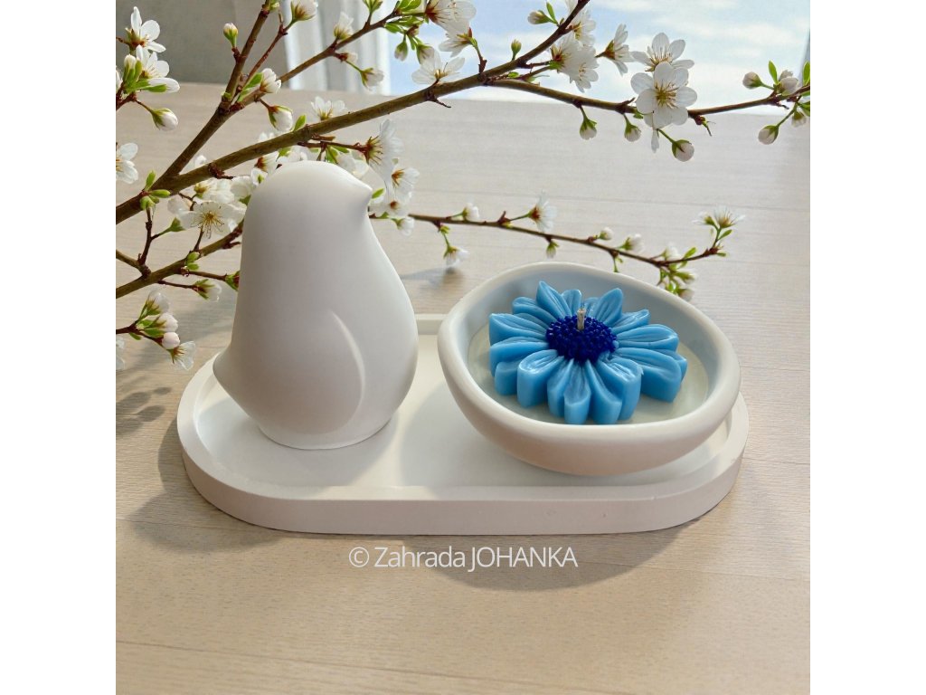 Nádobka je rovněž ručně vyrobena z inovativní směsi české výroby na bázi kararského mramoru. Po vytvrzení je sametově hladká, čistě bílé barvy, velice pevná a tepelně odolná do 500 °C. Doporučujeme ji po vypálení svíčky zachovat a vhodně použít. Naše nádobky se vyznačují především tím, že nevyžadují po vytvrzení žádné dodatečné ošetření chemickými látkami (akrylovými laky, apod.). Jsou tedy při vypalování vosku zcela zdravotně nezávadné. Směs neobsahuje pryskyřičná a sádrová pojiva, která mohou při vyšších teplotách praskat.