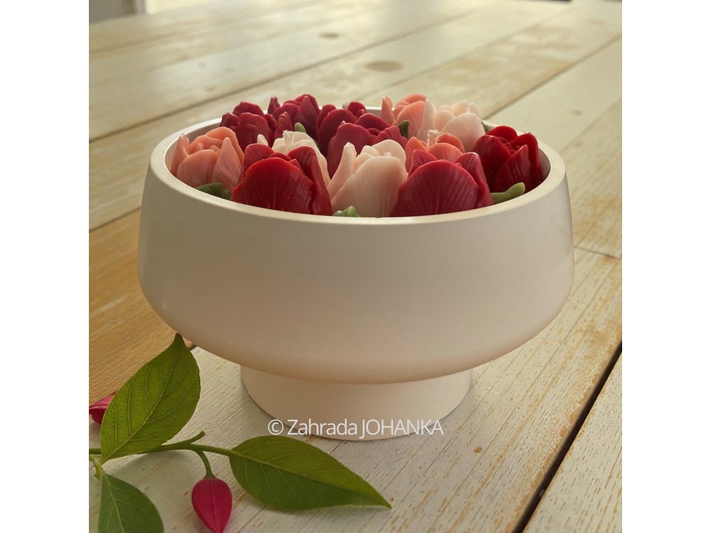 Nádobka je rovněž ručně vyrobena z inovativní směsi české výroby na bázi kararského mramoru. Po vytvrzení je sametově hladká, čistě bílé barvy, velice pevná a tepelně odolná do 500 °C. Doporučujeme ji po vypálení svíčky zachovat a vhodně použít. Naše nádobky se vyznačují především tím, že nevyžadují po vytvrzení žádné dodatečné ošetření chemickými látkami (akrylovými laky, apod.). Jsou tedy při vypalování vosku zcela zdravotně nezávadné. Směs neobsahuje pryskyřičná a sádrová pojiva, která mohou při vyšších teplotách praskat.