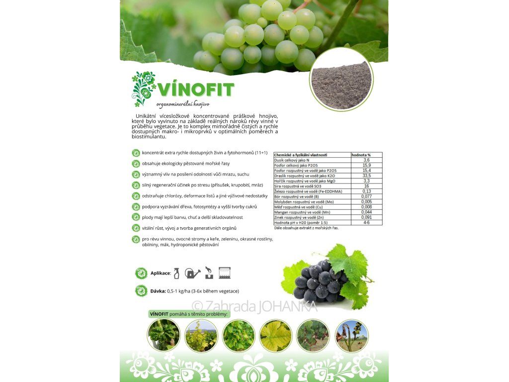 Vínofit je skutečně silný koncentrát makroživin, sekundárních živin a mikroživin (draslík, fosfor, dusík, hořčík, síru, bór, EDDHMA železo, molybden, mangan, zinek a měď). Obsahuje navíc přírodní biostimulant - mořské řasy. Ty se vyznačují ojedinělou vlastností - stimulují přirozenou obranyschopnost rostlin vůči stresovým faktorům (sucho, vysoké teploty, salinita půdy, patogeny). Vínofit je skvělým řešením pro komplexní doplnění živin na list a současně jako regenerační pomůcka rostlinám po prodělaném stresu (mráz, sucho, krupobití).
